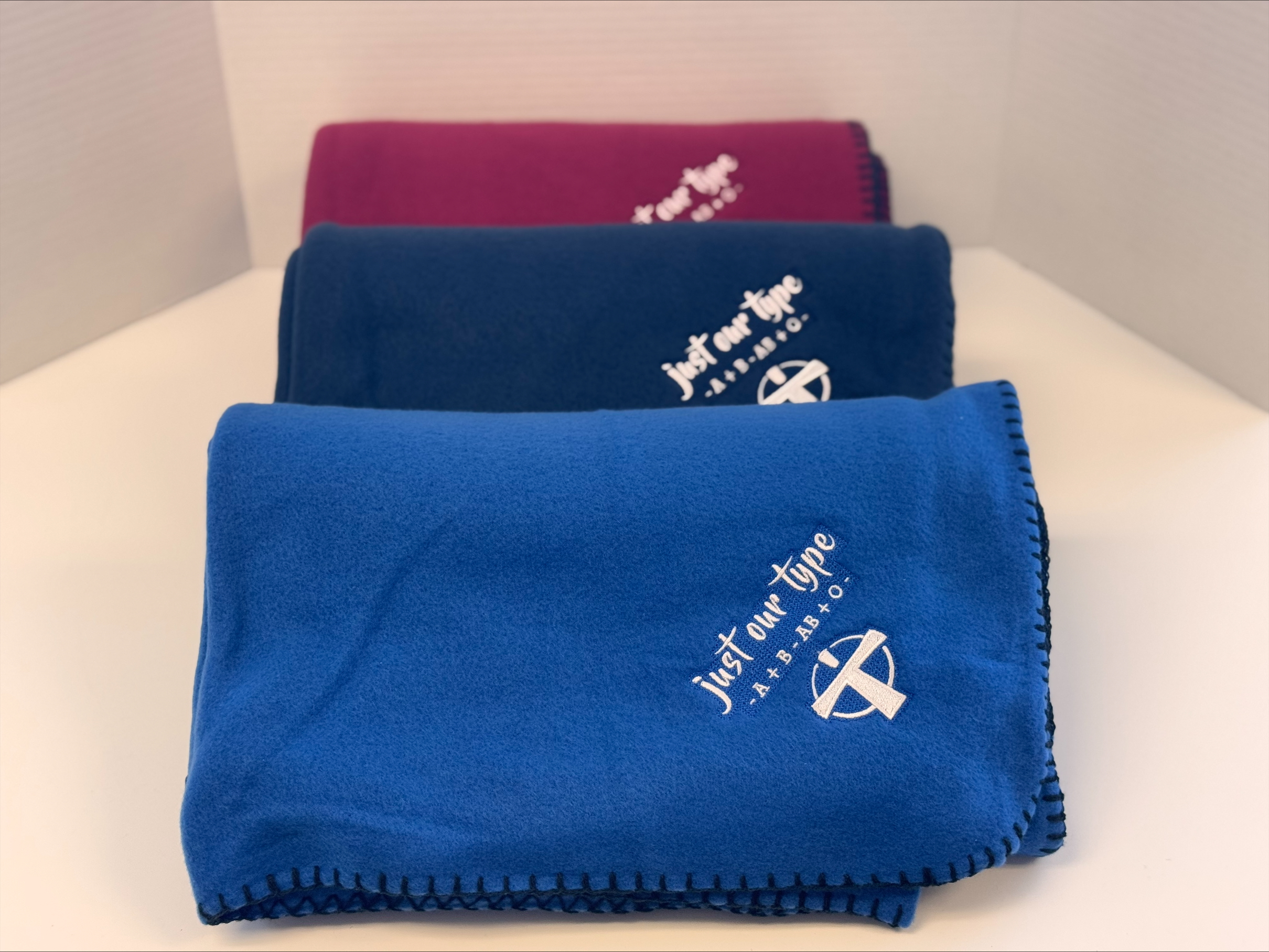 Lightweight fleece blanket available in 3 colors! Embroidered corner with "Just Our Type" logo. 100% polyester. Size: 58" x 44"