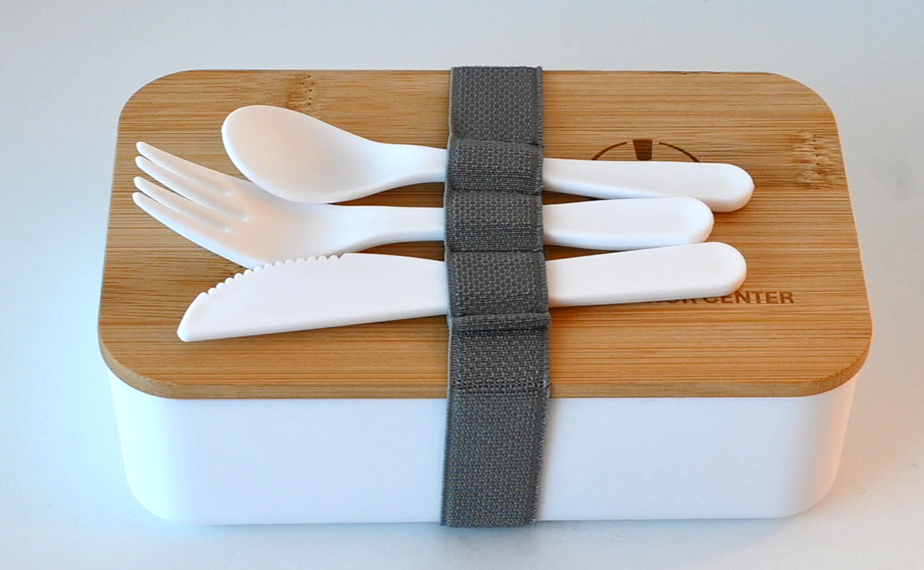 Included a bamboo lid with elastic closure straps. Fork, knife and spoon are included. Comes with a removable interior tray that has 2 compartments. Microwave and freezer safe. Size: 4.5" x 7.5" x 2.75"